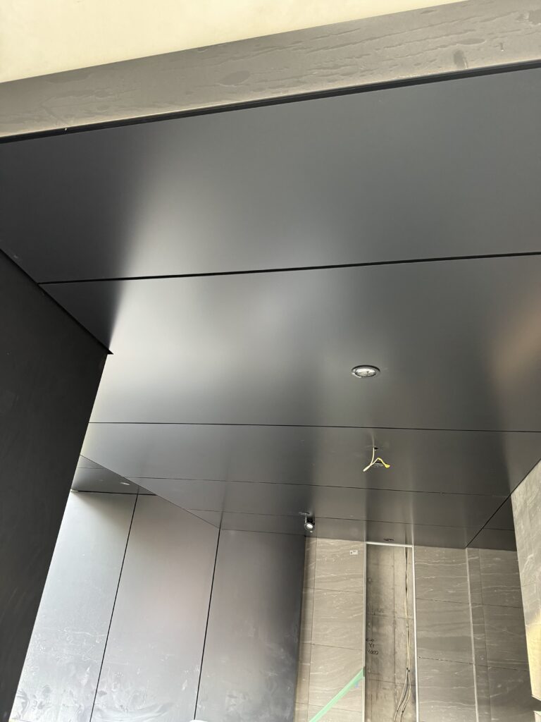 下地との取り合い、通り・レベルを確認しつつ、パネルのズレや不陸が出ないよう細部まで調整しています。