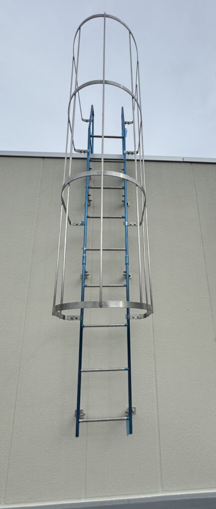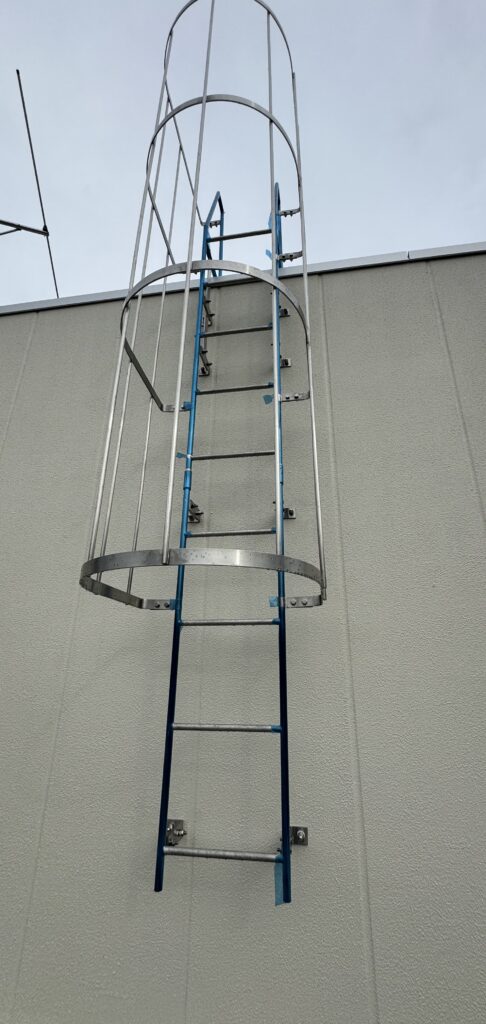今回は、建物外壁にタラップ本体の施工から背カゴ設置までを一式で対応しました。