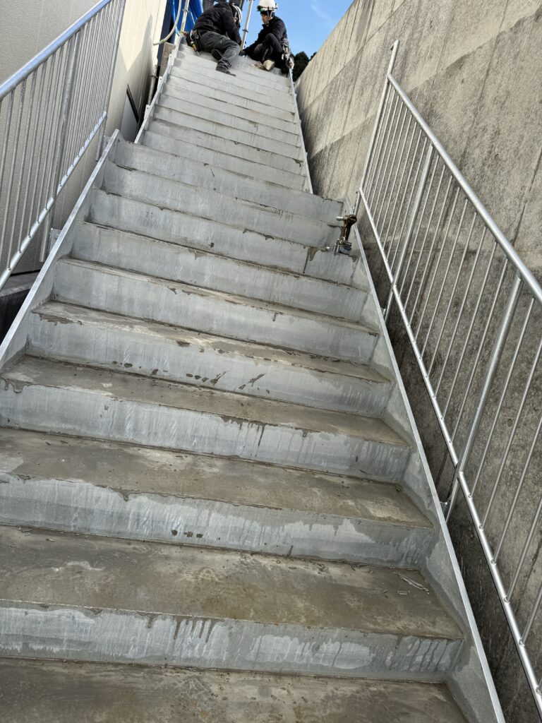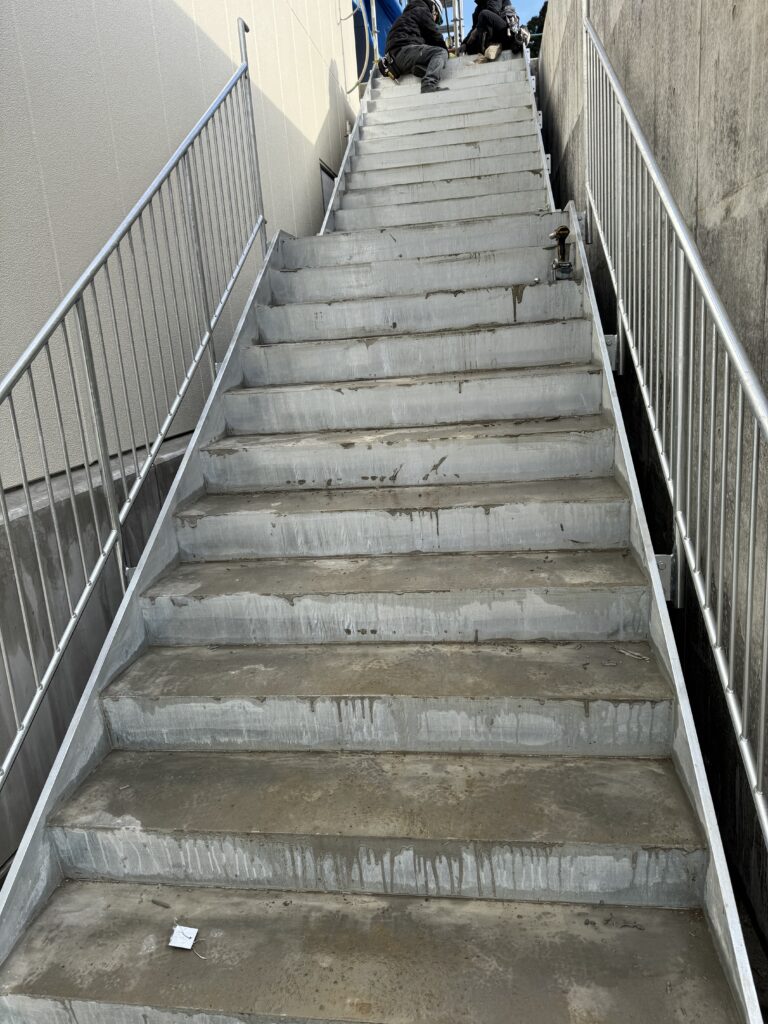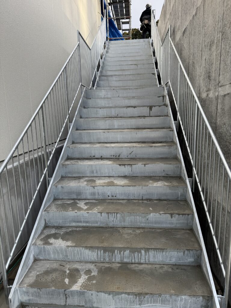 今回は、外部に設置された鉄骨階段の手摺取付工事を行いました。