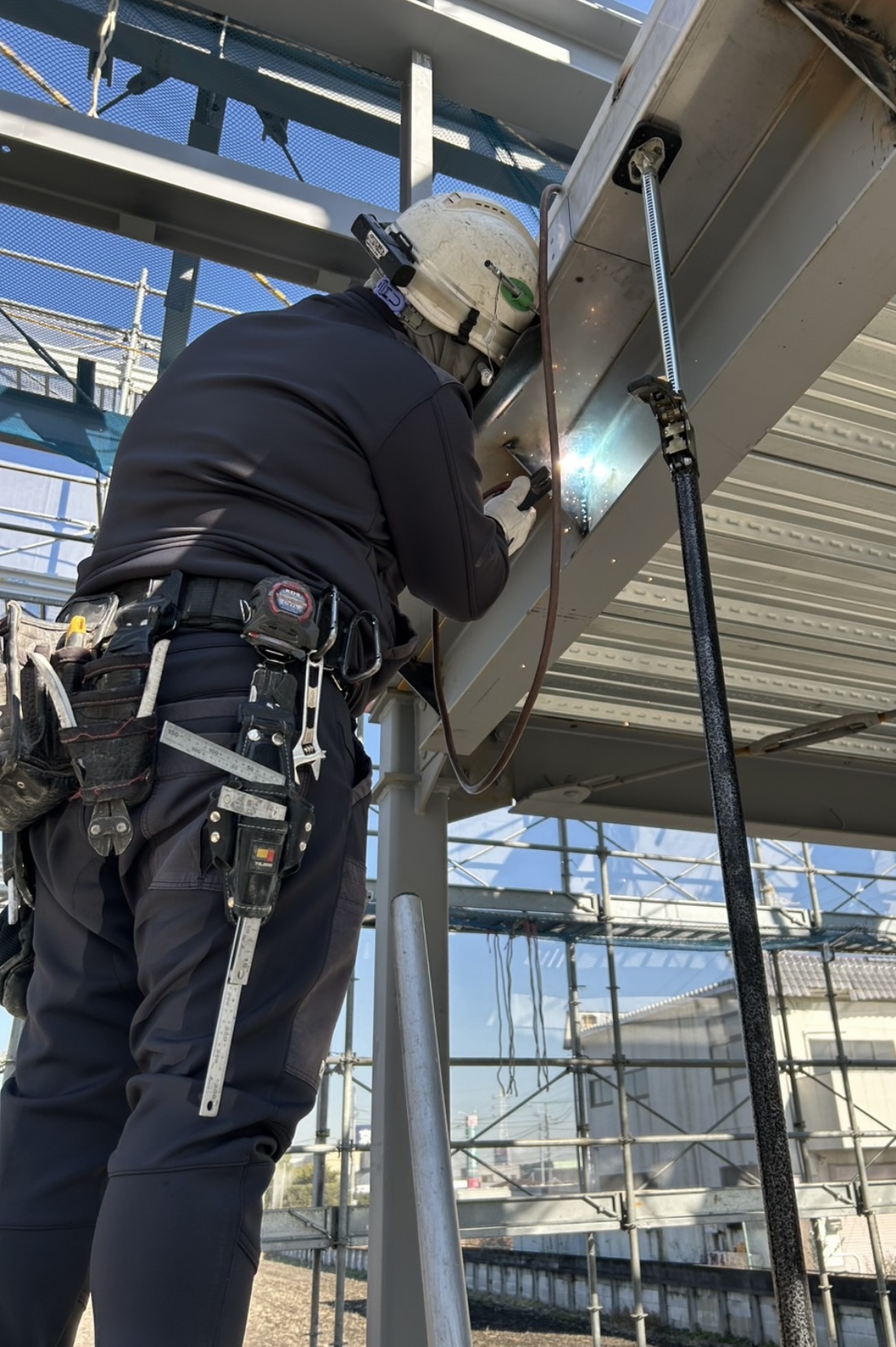 溶接作業にあたっては、周囲への火花飛散防止養生を徹底し、安全帯・足場環境を確保した状態で施工。